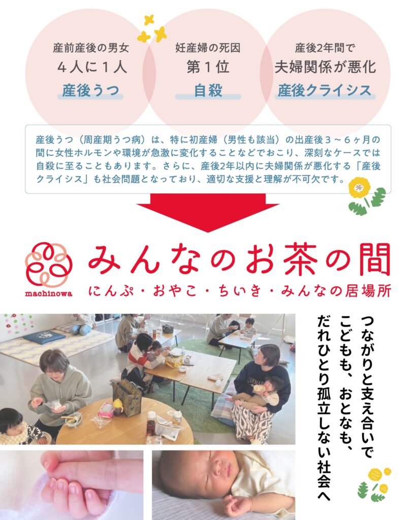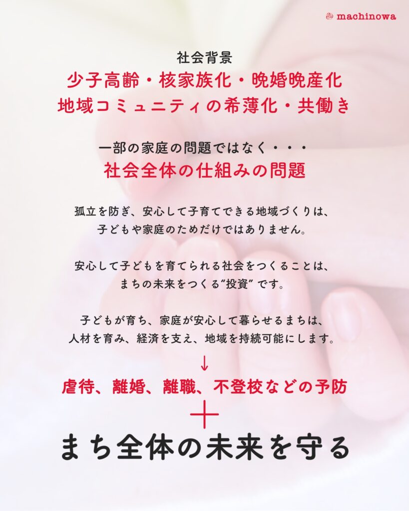 マチノワは、子育て中の人が孤立せず、安心してつながれるまちづくりを目指し、居場所づくりや相談支援、ネットワークづくりに取り組んでいるNPO法人です。
